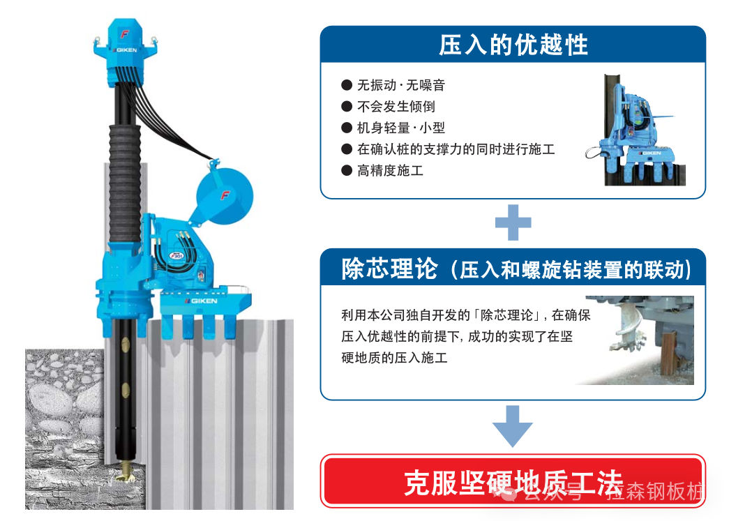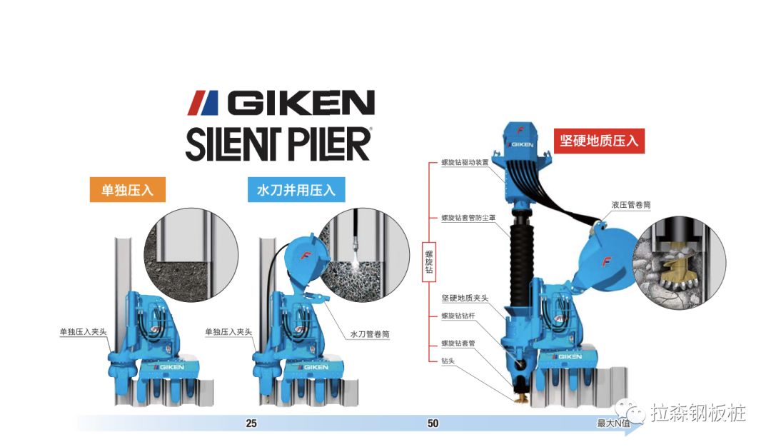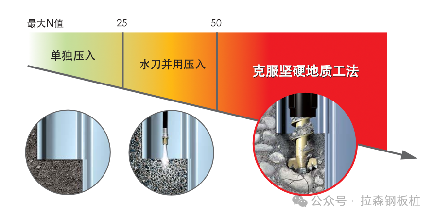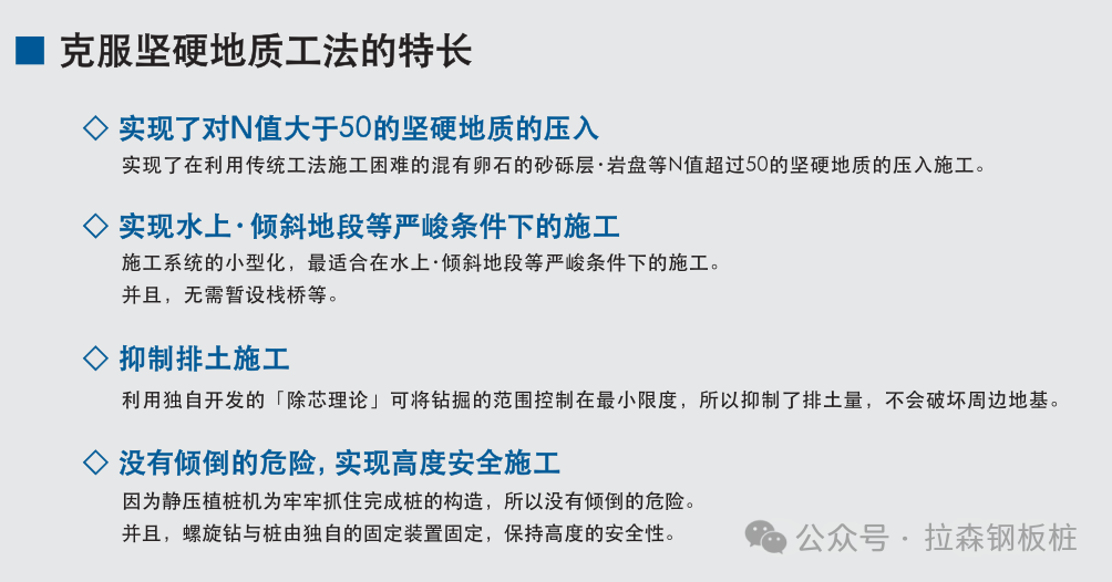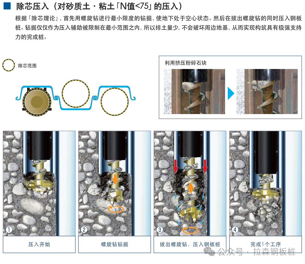 自行走压桩。在完成4根钢板桩后,架设下一支10)桩,压入桩至可获得充分的支撑力位置,打开固定夹升起机身,左右移动固定夹,移动基座至下一反作用力桩,锁定固定夹,完成自行走,采用上述方法持续压桩。 ▍4 质量控制 螺旋钻静压拉森钢板桩施工时的质量控制除常规的材料要求及焊缝质量要求外,还应注意以下几点: 1)在拼接钢板桩时,两端钢板桩要对正顶紧夹持于牢固的夹具内施焊,要求两钢板桩端头间缝隙不大于3 mm,断面上的错位不大于2 mm。 2)对组拼的钢板桩两端要平齐,误差不大于3 mm,钢板桩组上下一致,误差不大于30 mm,全部的锁口均要涂防水混合材料,使锁口嵌缝严密。 3)在使用拼接接长的钢板桩时,钢板桩的拼接接头不能在支护的同一断面上,而且相邻桩的接头上下错开至少2 m,所以,在组拼钢板桩时要预先配桩,在运输、存放时,按植桩顺序堆码,植桩时按规定的顺序吊桩。 4)焊接锁口两侧20 mm区域内的氧化皮、赃物、油污等全部清理干净直至见到金属光泽方能施焊,施焊过程中严禁使用潮湿的焊条,焊工根据施工工艺选择正确的焊条、焊流,焊接过程中应注意起弧和收弧质量,控制焊接速度不要太快。 ▍5 结 语 本基坑支护工程采用螺旋钻静压拉森钢板桩施工技术进行拉森钢板桩的施工,满足了设计要求和工期要求,且可节约成本。在城市建设工程中,遇坚硬土层导致常规施工工艺成桩困难时,采用克服坚硬地质工法具有良好的效果。 / 扩展阅读 /