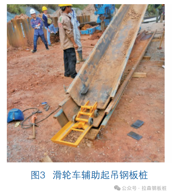 2)桩机就位。对钢板桩施工场地进行平整,使整平度符合施工要求,采用25 t吊车将静压植桩机的中心点置放于反力基座上,使用夹具夹紧反力基座。 3)吊桩、稳桩、校核。吊装钢板桩时采用专用滑轮车(图3),对钢板桩身进行保护,防止在吊装钢板桩时刮花或破坏桩身,确保桩身质量。将钢板桩吊至静压植桩机夹具中,对准桩位,夹紧并压入土中,使用激光指向仪控制桩的线形,采用靠尺控制桩的垂直度,移动静压植桩机调节桩垂直度,垂直度偏差不得超过0.5%。