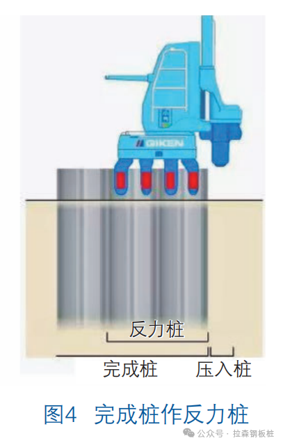 4)螺旋钻引孔。对桩位坚硬地质进行钻进引孔,螺旋钻进与静力压桩同时进行,并稍超前钢板桩沉桩深度,以消除压力球根的现象。引孔完成后再将螺旋钻从钻孔中拔出。 5)压桩。稳桩后,启动夹持油缸和压桩油缸,把桩平稳压下,如此往复工作,压桩过程不宜过快,其间要反复检查,确保桩身的垂直度、锁口咬合度及桩顶标高。在压桩过程中发现桩垂直偏差较大时应及时纠正,桩压至一定深度发生严重倾斜时,不宜采用移机方法来校正,应拔出重新对桩,接桩时要保证上下两节桩在同一轴线上。 6)检查验收。检查已完成的钢板桩桩身垂直度、锁口咬合度及桩顶标高是否满足规范要求,若不满足须将钢板桩拔出重新压入。 7)移机。一根钢板桩完成,检查合格后,利用桩机自带滑动座,控制机子在已完成的钢板桩上行走,移动至下一根钢板桩正上方。 8)焊接钢板桩锁口。压桩完成后,将新完成钢板桩锁口与前一根钢板桩锁口焊接,前后钢板形成整体,提高整体结构的稳定性,且使静压植桩机自行走压桩时能稳定作业。 9)撤除反力基座。采用压入第1根桩的方法循环施工,依次压入前4根钢板桩,使静压植桩机的夹具均可牢固地夹住钢板桩,满足桩机自行走压桩条件(图4)。满足自行走压桩后,撤除基座两侧的钢板桩,接着撤除反力重块后,再撤除反力基座。
