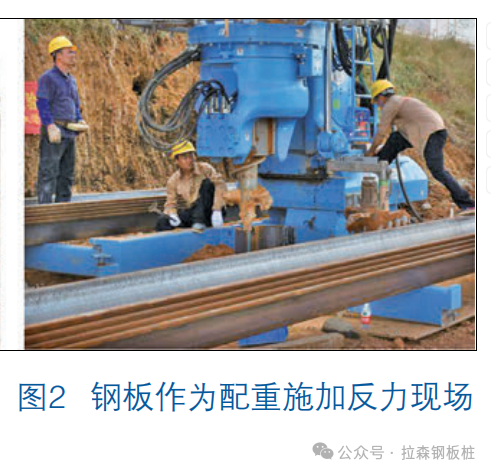 ▍2 施工工艺特点分析 本工程基坑支护工程设计采用拉森钢板桩,桩端持力层为砾砂、圆砾、泥岩等坚硬土层。常规静压钢板桩施工工艺是将钢板桩在外压力的作用下贯入地层成桩,与桩底接触的土粒因受到挤压,会形成“压力球根”,桩底阻力变大,导致中硬度地层中钢板桩难以压入。采用螺旋钻静压拉森钢板桩施工技术,将螺旋钻引孔系统与静压植桩机结合为一体,利用设备自带螺旋钻钻进各类坚硬地质引孔后压入钢板桩,通过带有可钻进的螺旋钻头进行钻进取土(岩)引孔,降低钢板桩桩侧及桩底贯入阻力,将钢板桩顺利压入,保证了钢板桩压入垂直度、深度及施工质量,提高施工效率。 ▍3 施工过程控制要点 3.1工艺流程 主要施工流程:测量放线→设置反力重块→桩机就位→吊桩→引孔→压桩→检查验收→移机→焊接锁口→完成前4根桩→撤除反力基座→自行走压桩。 3.2测量放样 根据已布设好的控制点坐标,计算坐标位置,将桩位附近场地整平后,使用全站仪放出桩位,用水准仪测量地面高程,确定成桩深度。钢板桩放线施工,桩头就位必须正确、垂直,线形采用激光指向仪进行控制,确保成桩后的整体稳定性。沉桩过程中,随时检测,发现问题,及时处理。沉桩容许偏差:平面位置纵向100 mm,横向为-50~0 mm;垂直度为≤0.5%。 3.3静压桩施工 1)设置反力基座。压桩初期采用钢板桩作为配重施加反力,在静压植桩机的反力基座两侧垂直放置钢板桩(图2)。根据钢板桩的贯入度设置反力配重。