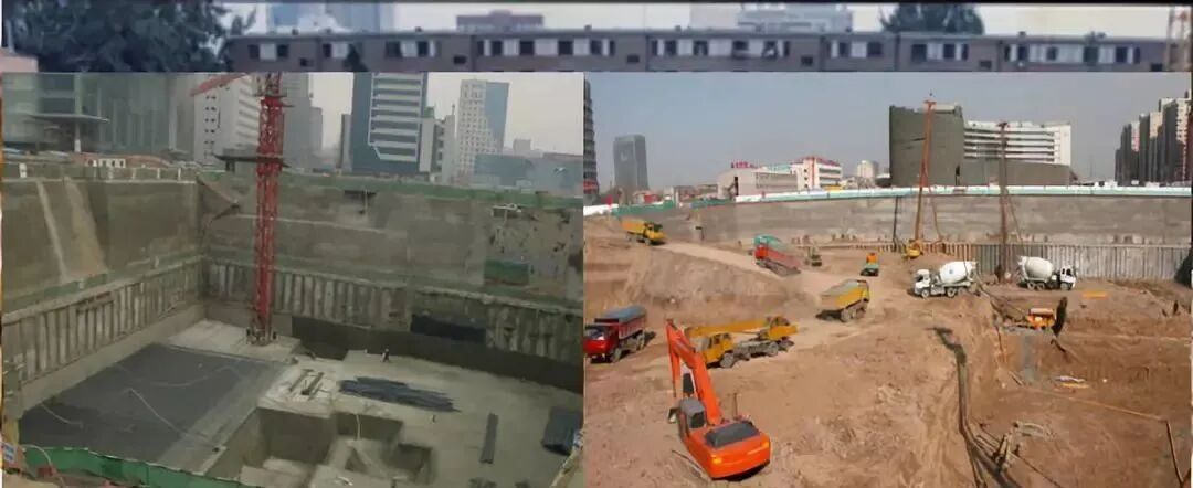 4)中央开挖施工法:先施工基坑四周排桩,桩内放坡开挖后施工中央部分基础工程,待完工后再挖除排桩内侧土体,边挖边用支撑杆将支护排桩与中央部分基础工程支撑起来,最后再施工周边基础工程。