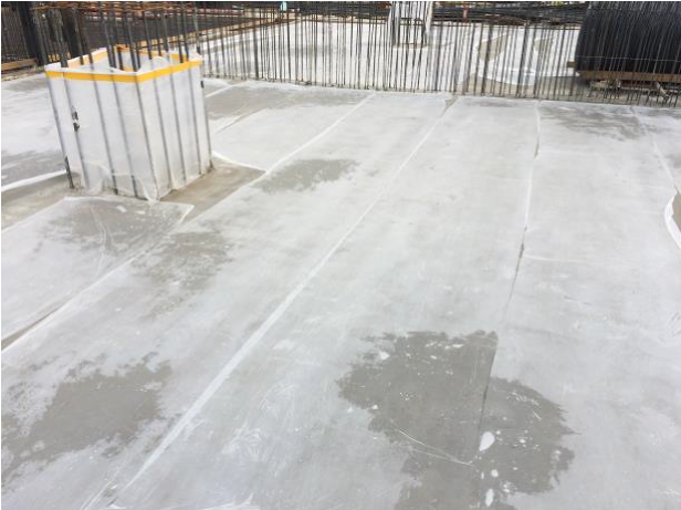 控制标准: 混凝土表面处理,应做到“三压三平”; 浇筑至设计标高,大尺刮平,第一次抹压;局部使用抹子二次摸压收平;终凝前磨光机三次打磨,防止表面裂缝产生。 (4)基础混凝土养护 施工要点: 收面完成后铺设塑料薄膜,并在12h 内撒水养护。