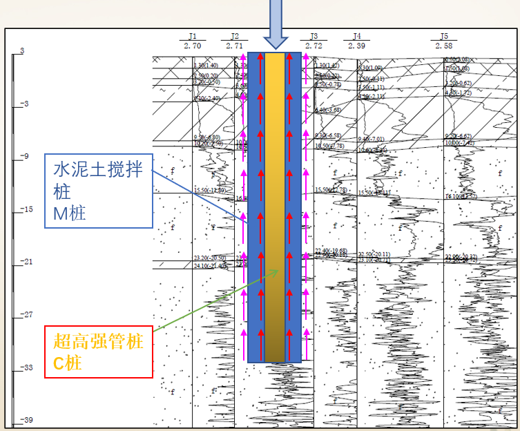 ![]() 00.劲性复合桩的由来 工程桩常用的桩型有钻孔灌注桩、预制桩。钻孔灌注桩易产生坍孔、颈缩,桩底沉渣不易清除,桩身质量不易控制,且存在噪声污染严重、泥浆排放量大等环境问题; ![]() 预制桩易产生挤土效应,对周边环境影响较大,遇密实性砂层施工的难度大,成桩质量难以保证。 ![]() 通过对现有常规桩型的优化,改造形成劲性复合桩先进工艺。劲性复核桩施工技术是由水泥土类桩(M)、混凝土类桩(C)等通过一定的工艺,将两种单体桩进行复合,形成劲性复合桩的一项技术。 ![]() 劲性复合桩构造示意图 可充分发挥地基土与桩材相互结合的复合作用,劲性复核桩将常用的M桩、C桩单一桩型相互复合,后一种桩体在前一种桩体上进行再次施工,形成互补增强的劲性复合桩型。 01.工艺简介 最常用的MC复合桩施工时按设计桩径要求,在注浆的同时进行搅拌形成水泥土搅拌桩,在搅拌后的水泥土未初凝前(6h)植入预应力混凝土管桩,构成劲性复合桩。 ![]() 劲性复合桩施工工序图 工地现场需提前做好施工组织规划和两种打桩机的移动路线,尽量按照“分区施工,统筹管理”的原则安排施工流程。在桩基施工阶段对整个工程进行合理分区,各分区交错、流水施工。在各个划定的施工区域内再划分若干个小单元,确保“限时”施工的实现,达到材料、设备、劳动力均衡使用的目的。 ![]() 02.工艺优点 通过对现有常规桩型的优化,改造形成劲性复合桩先进工艺,可充分发挥地基土与桩材相互结合的复合作用,吸取了预制桩和灌注桩的优点,摒弃其缺点,因此施工效率高、经济效益好、环境影响小的特点,主要具有以下优点: 1、承载力高,桩端的阻力和桩侧的摩擦力可以通过混合水泥浆和桩周围的土壤来加强。 2、施工工艺为非挤土工艺(搅拌成孔后植桩),大大降低了对周围环境的影响。 3、泥浆排放量小,符合文明施工要求。 4、与其它桩型相比,成桩速度加快,工效提高,工期缩短。 5、预应力混凝土管桩厂批量加工,质量可靠,工艺成熟,操作方便。 6、适用于软土、粘土、粉土、粉砂、风化岩等各种土层。 7、采用螺锁连接,接桩速度快,保证了植桩的连续性。 8、与传统桩型相比,具有一定的经济优势。 ![]() 03.工作原理 上部荷载通过芯桩传递给搅拌桩,再通过搅拌桩传递至桩侧土层中,搅拌桩充当了芯桩与桩侧土之间的传递介质。 ![]() ![]() 04.适用范围 由于深层搅拌桩的应用存在一定局限性,它适用于处理正常固结的淤泥与淤泥质土、粉土、饱和黄土、素填土、黏性土等软弱地基。所以劲性复合桩适用范围也受其影响,主要适用于以下土层的地基: 淤泥、淤泥质土、黏性土、粉土、砂土以及人工填土等地基; 适用于泥炭土、有机质土、pH值小于4的土、塑性指数大于25 的黏土,或地下水渗流影响成桩质量以及在腐蚀性环境中和无工程经验的地区时,应通过试验确定其适用性。 05.设计依据 劲性复合桩以其具有不易塌孔、沉桩难度低、承载力高、施工速度快、泥浆排量低、经济性高等优点,越来越多的在常规工程和国家重点工程中得到成功应用。形成了一系列的关键技术,经过提炼和总结,已经发布并实施了相关技术标准中华人民共和国行业标准《劲性复合桩技术规程》(JGJ/T327-2014)、江苏省工程建设标准《劲性复合桩技术规程》(DGJ32/TJ151-2013),从而推动我国建筑行业的发展进步,提高我国建筑施工行业的技术水平。 ![]() 国家标准 ![]() 江苏省标准 06.典型案例 1、项目基本信息: 某项目为高层/小高层住宅建筑,总建筑面积约50万㎡,共16栋高层(地上20-26层)、4栋小高层(地上8-10层)住宅建筑,地下一层/二层。主楼采用剪力墙结构,基础采用桩基。高层部分桩基初步方案主要为灌注桩、劲性复合桩、预应力管桩。 ![]() 地质概况:主要持力层⑤1、⑤2、⑦层土层均为砂层土,土层厚度较厚。 ![]() 土层参数表 ![]() 典型土层剖面 2、特殊不利因素: 场地存在大量老桩,在布桩时需避开老桩,在桩基设计时应优先考虑减少桩数,采用高承载力的桩基。 ![]() ![]() 新桩老桩布置叠图 3、方案比选: 管桩:根据地勘及当地其余项目的经验,管桩难以穿越5-1及5-2砂土层,如此桩长较短,单桩承载力特征值低,无法应用到24层主楼高层。存在承载力不足、沉桩难度高的问题,因此方案不成立。 ![]() 钻孔灌注桩:本场地⑤1、⑤2、⑦层土层均为砂层土,土层厚度较厚,容易塌孔。且灌注桩施工速度慢,难以满足工期要求,且造价高。存在容易塌孔、施工速度慢、泥浆排量搞、造价高的问题。 ![]() 劲性复合桩:本项目经过多轮比选,最终选用M800+C600劲性复核桩,通过三轴搅拌既解决成孔问题又可以进行护壁,解决塌孔问题;同时单桩承载力高,利于布桩,且施工速度快和经济效益好。 ![]() 4、方案对比: 劲性复合桩与灌注桩对比: 针对场地内的16栋高层主楼,进行了两种桩基方案的布桩用量统计如下表: ![]() 同时节约了大量工期,劲性复合桩的施工速度大约为比钻孔灌注桩快50%。 加入QQ群(4群),我们一起来探索 YJK-GAMA的无限可能!